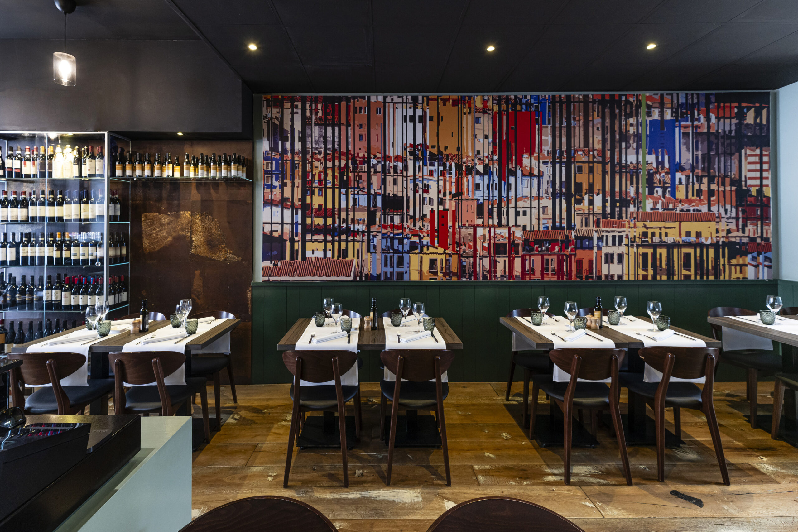 La déco intérieure a été pensée par l’architecte Tarek Ben Kaddour, qui a su donner au lieu une belle convivialité par la création de deux ou trois atmosphères bien distinctes, comme cette grande cave à vins vitrée située à l’entrée et plus vers le fond, le portrait en tryptique de Toto, géant du cinéma italien. De la cuisine semi-ouverte, on perçoit l’activité du chef et de son équipe qui s’affaire à préparer des assiettes aux saveurs intenses et à la présentation recherchée.