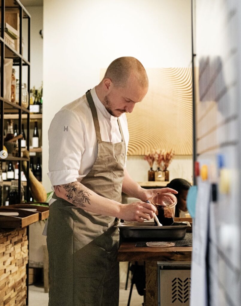 Véritable artiste du végétal, le chef autodidacte Elliott Van de Velde propose une cuisine durable et intuitive, mettant en valeur des produits locaux et de saison. Installé dans une bâtisse du XVIIIe siècle sur la place Saint-Géry, Entropy propose des menus de 4 à 8 services, où chaque plat célèbre un ingrédient phare, tel que le céleri-rave ou la betterave, sublimé par des techniques comme la lactofermentation ou le fumage. Bien plus qu’une table gastronomique, Entropy est aussi le moteur du Hearth Project, une ASBL fondée en 2019 avec Adeline Barras, visant à lutter contre le gaspillage alimentaire et la précarité. Les bénéfices du restaurant financent la préparation de repas solidaires à partir d’invendus, distribués à des associations bruxelloises.