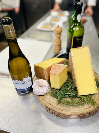 Dans les cuisines impeccables de l’établissement, le chef nous initie à l’un des plats emblématiques de la région : le Berthoud, une recette traditionnelle à base de fromage d’Abondance, d’ail et de vin blanc. Simple, rustique, mais inoubliable !