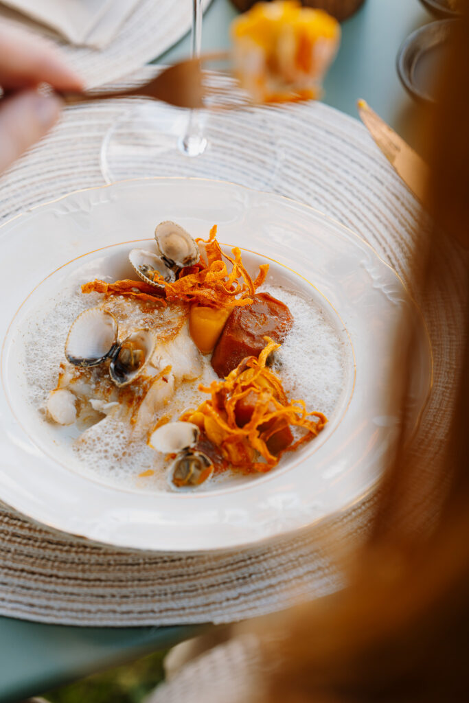 A ses côtés, Benoit Brochard, gère la salle avec dynamisme et sourire. Il a fait son école chez les plus grands : Pierre Gagnaire (3 étoiles à Paris), Bon Bon (2 étoiles à Bruxelles) et a été sacré Meilleur Maître d’Hôtel de France en 2019.