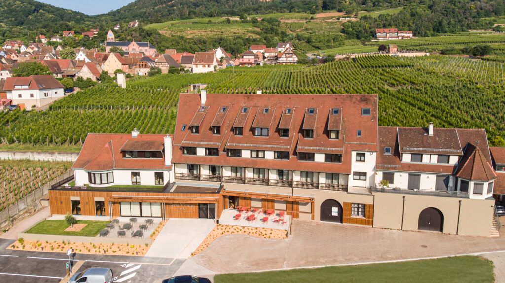 Nichée dans le charmant village de Gueberschwihr, au pied des collines verdoyantes de l’Alsace et sur la célèbre Route des Vins, Terra Vinum est bien plus qu’un simple hôtel : c’est un lieu unique où se mêlent œnotourisme, bien-être, hospitalité et culture viticole. Inauguré récemment après une rénovation complète, Terra Vinum incarne la rencontre entre la tradition viticole alsacienne et une offre hôtelière contemporaine et raffinée dans un paysage aux doux replis.